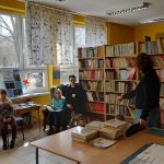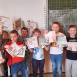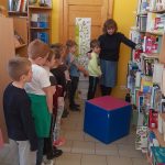 Szukaliśmy listów z prośbami książki, które skierowała do dzieci. Uczestniczyliśmy w rozmowie dotyczącej zasad zachowania się w bibliotece. Starsza koleżanka i kolega przeczytali nam fragment opowiadania „Pan Błysk” J.R.R Tolkiena. Na zakończenie naszej wizyty złożyliśmy przysięgę czytelnika, a na pamiątkę spotkania każdy uczeń otrzymał w prezencie książkę oraz plakat z alfabetem.